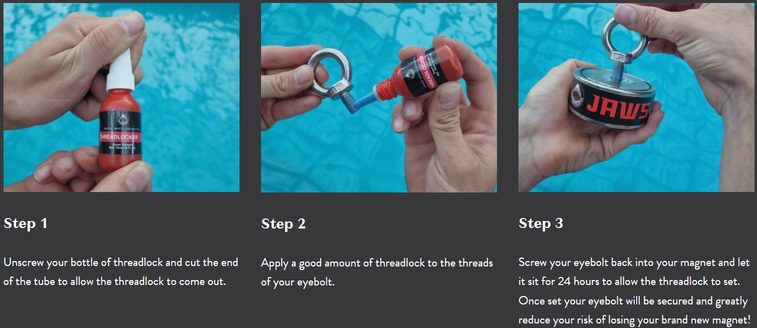 It is critical to threadlock your magnet so that the eyebolt which you tie your rope onto, doesn’t come undone in the water!